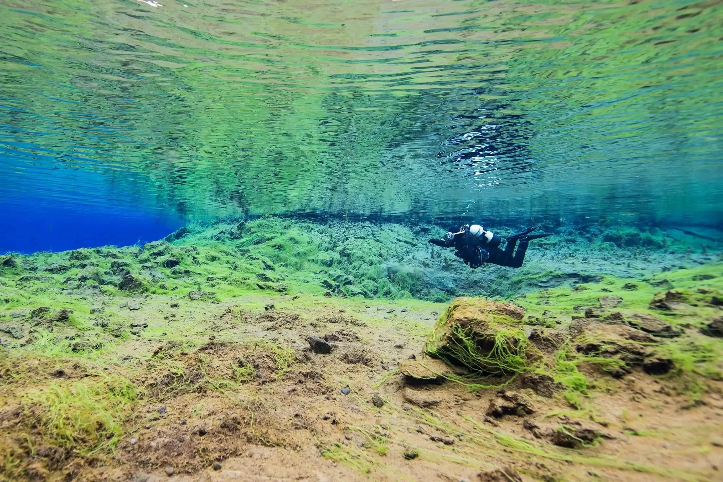 Drifting between tectonic plates in the crystal-clear waters of Silfra—a surreal underwater experience unique to Iceland